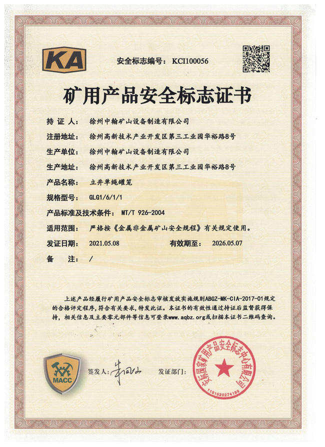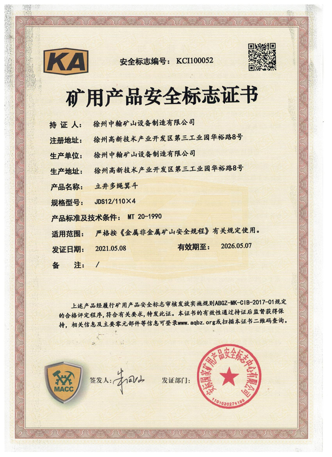 JX-8斜井箕斗礦安證書(shū)
